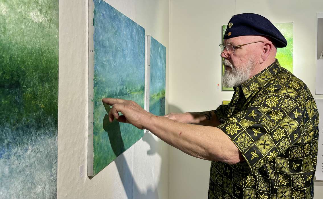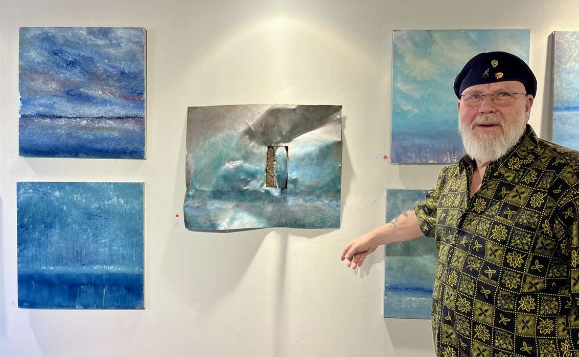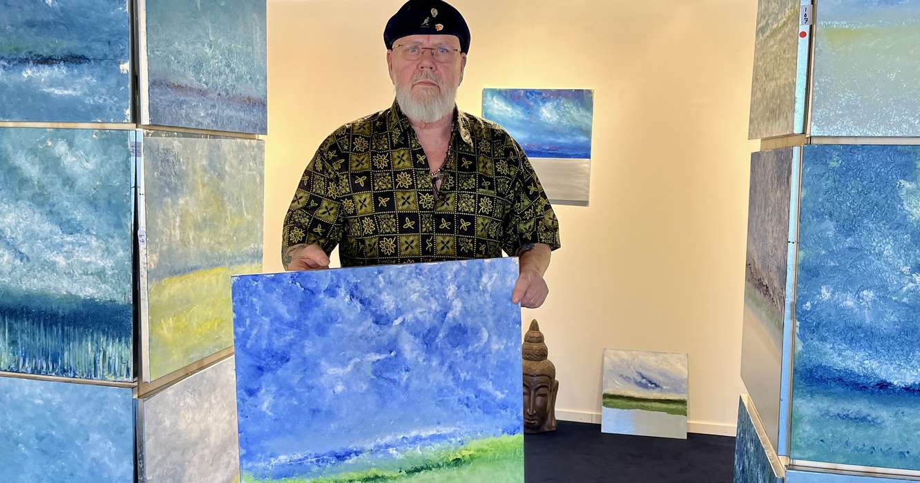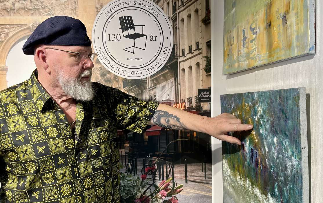 Per Borger vill inte ha pengar för sin konst. Han menar att han klarar sig ändå. Den som vill ha en målning får skänka valfri summa till välgörande ändamål. Foto: Johan Jönsson