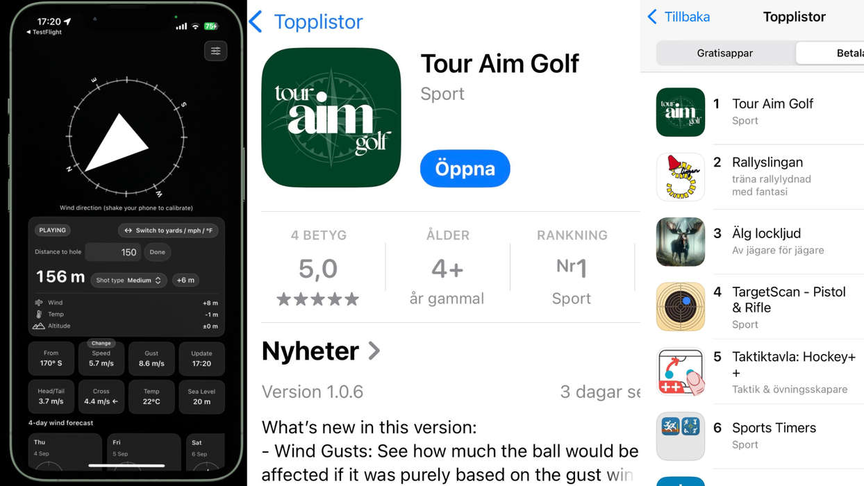 Tour Aim Golf-appen gick på bara 48 timmar upp i topp på listan över mest nedladdade sportbetalappar. Foto: Skärmbild Appstore