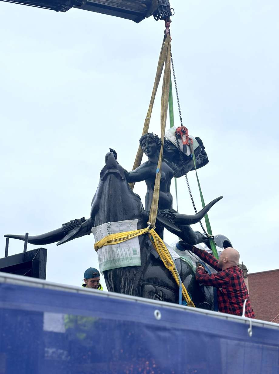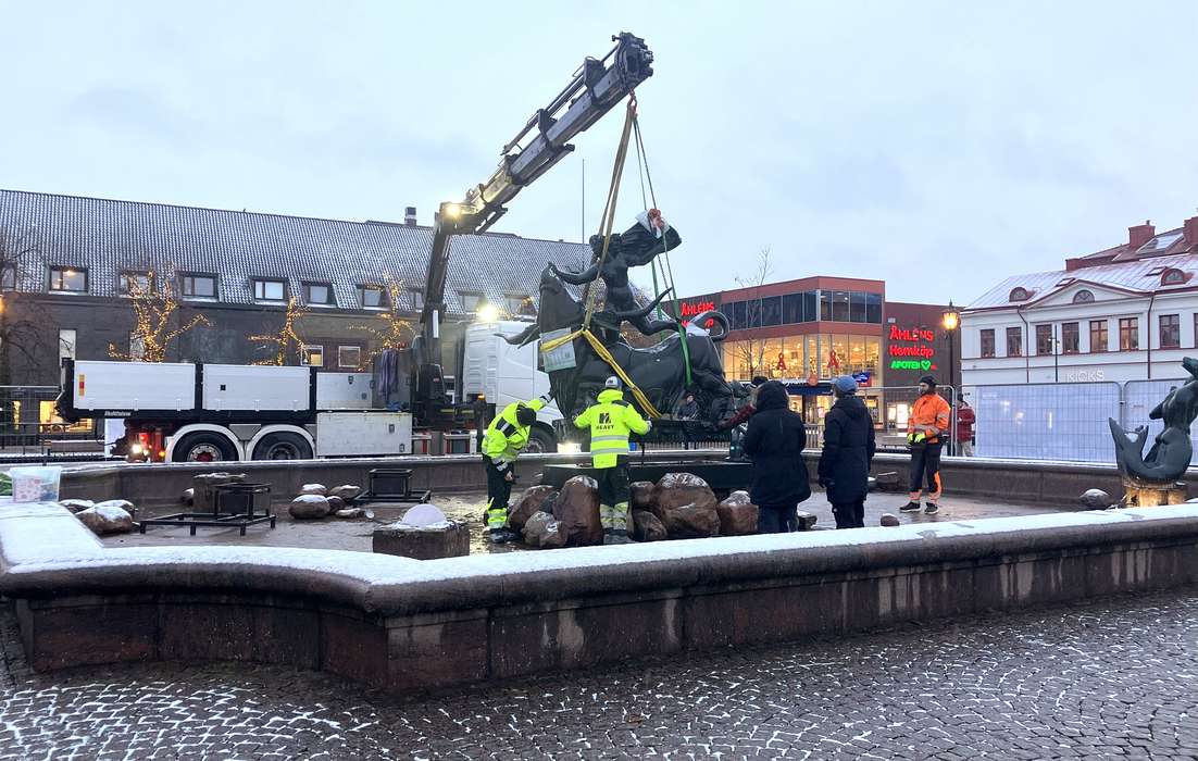 Europa och Tjuren lyfts bort från Stora torg för att ge plats åt den stora torgombyggnaden. Nu ska vattenskulpturen restaureras för att sedan återplaceras på samma plats hösten 2027. Foto: Kristin Ekström