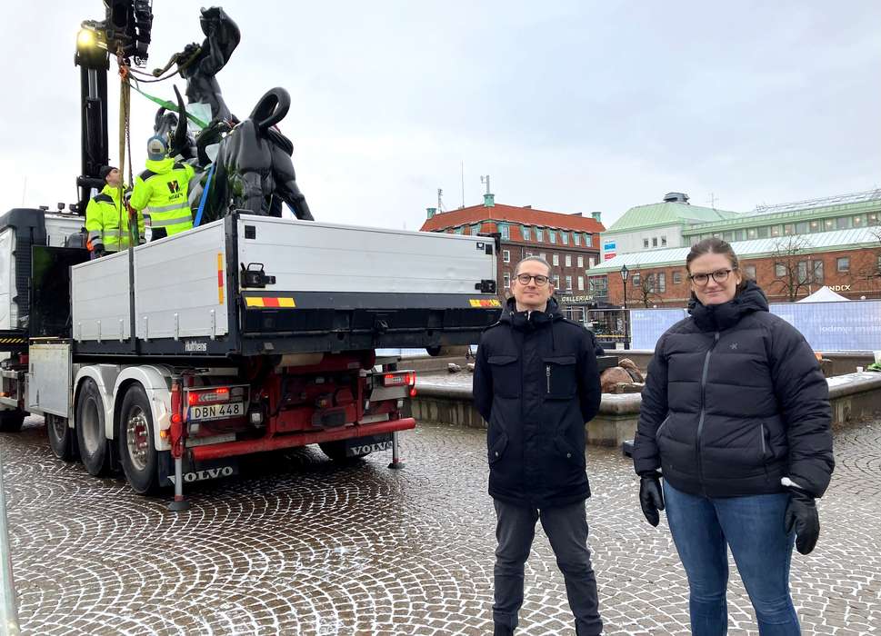 Allt gick som en dans när Europa och Tjuren lyftes berättar Joacim Eneroth, konstintendent på Halmstads kommun. Bredvid honom står Sofia Erlöv som projektleder ombyggnaden av Stora torg. Foto: Kristin Ekström