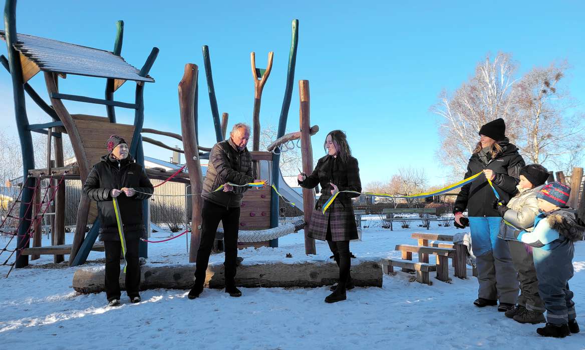Teknik- och fastighetsnämndens ordförande står med saxen i handen. I ett närmast perfekt vinterväder är det bara minuter kvar tills bandklippning äger rum för att inviga kommunens senast renoverade lekplats.