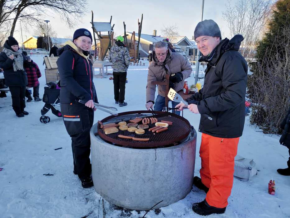 – Jag tycker det är jättekul och bra att kommunen satsar på barnen! Den gamla lekplatsen var inte så bra, men den nya är trevlig och även bra upplyst. Hit kommer vi att gå många gånger, säger Robin och förser barnen med grillad korv.