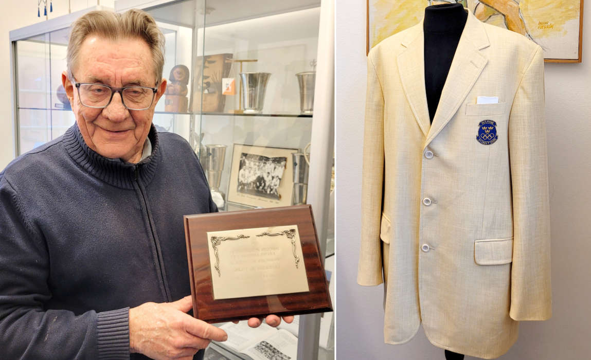 När Drott spelade cupvinnarcupfinal, 1990, mot spanska Teka Santander fick Olle Hagström en vänskapsplakett från presidenten i den spanska regionen. Till höger syns Drott-profilen Ola Lindgrens OS-kavaj från Sydney-OS, 2000. Foto: Rickard Gustafsson