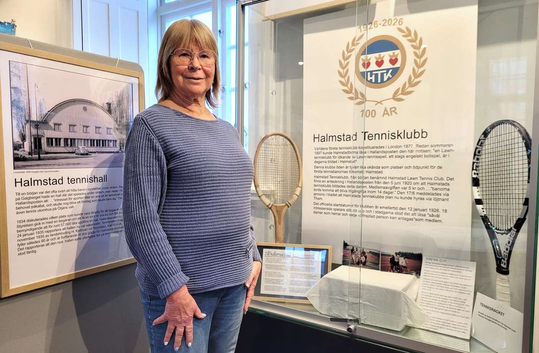 Ulla Winblad i den del av utställningen som handlar om tennisens historia i Halmstad. Faktum är att tennishallen (till vänster i bild) även var hemmaplan för handbollen under delar av 1930- till 1950-talet. Foto: Rickard Gustafsson